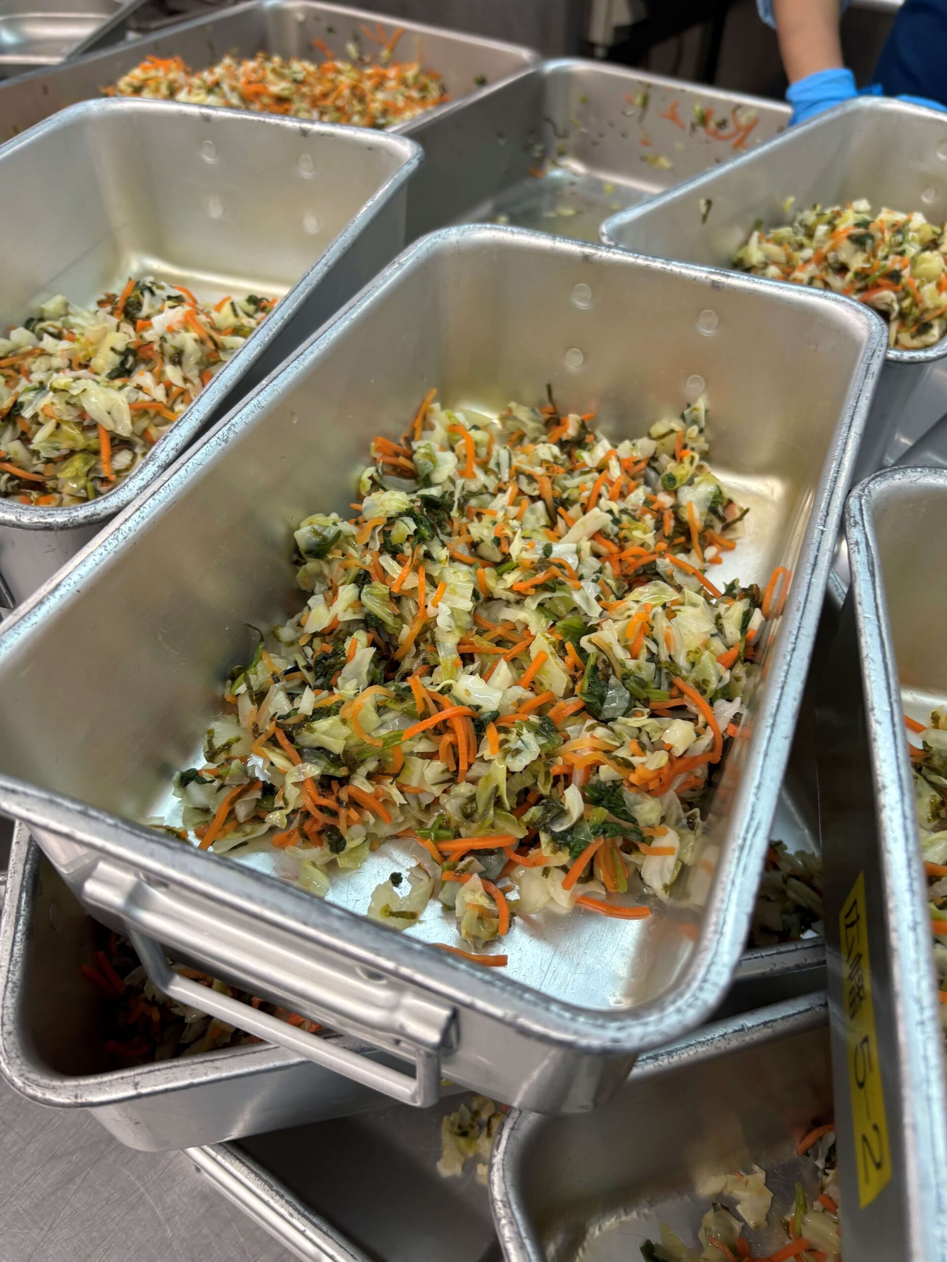 クラス・人数ごとに食缶へ分けて、当日の朝にお届けします。お客様による盛りつけが必要です。